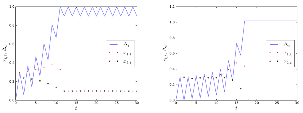 The right panel of the figure captures a situation where profits in the future are even more important. Here, firm 1 is incentivized to innovate until firm 2 is literally kicked out of the market (has 0% market share) and does not innovate at all. As a best response, firm 1 also does not innovate at all (red dots and black stars remain at zero). Both figures show that, after the initial phase of competing for the market, firm 1 virtually monopolizes the market: economists say, the market has tipped.